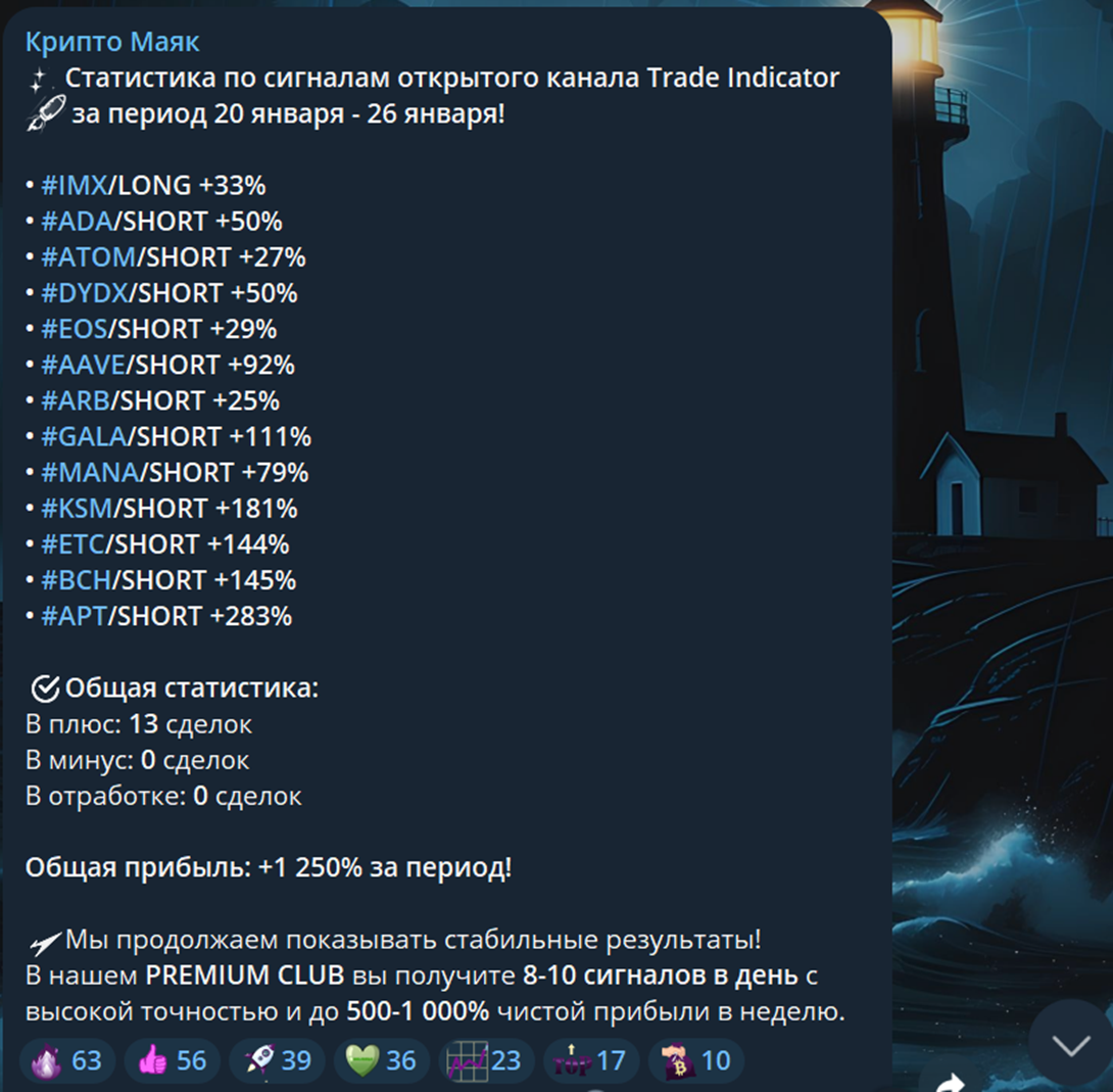 В первых постах трейдер приводит статистику торгов за период с 20 по 26 января. В ней указано 13 прибыльных сделок, без каких-либо убытков. Подтверждений данных результатов в виде скринов с биржи или иных источников нет. Поэтому такие заявления не вызывают доверия. В конце поста указана реклама премиум-клуба, где подписчикам предоставляют высокоточные сигналы. На них можно заработать до 1000% прибыли за 1 неделю торгов.