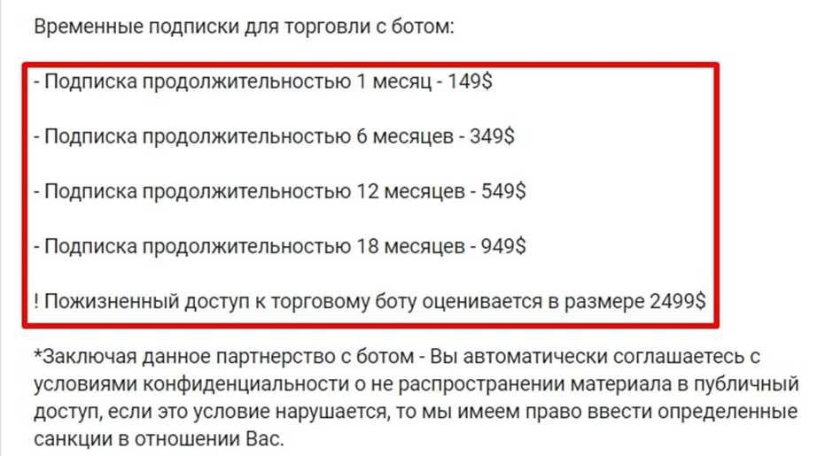Об эффективности торгового бота и информации из закрытого клуба, ничего неизвестно. Пробного периода нет. Непонятно принесут ли услуги Игоря прибыль.