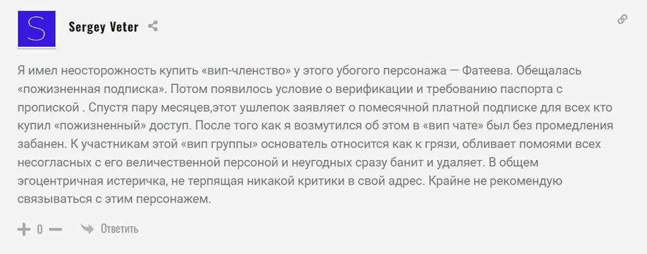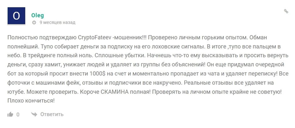 Чтобы провести честный обзор, мы изучили все положительные и отрицательные отзывы о «Криптофатеев». Все чтобы понять, можно ли заработать с Фатеевым. Однако, негативных комментариев оказалось больше. Пользователи обвиняют Игоря в разводе и мошенничестве. Они не рекомендуют платить трейдеру за бот или подписку в его клуб.