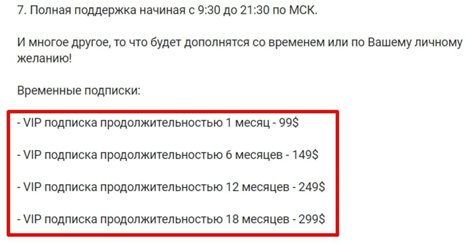 Цена на подписку в вип клуб, также зависит от срока, на который вы ее оформляете:
