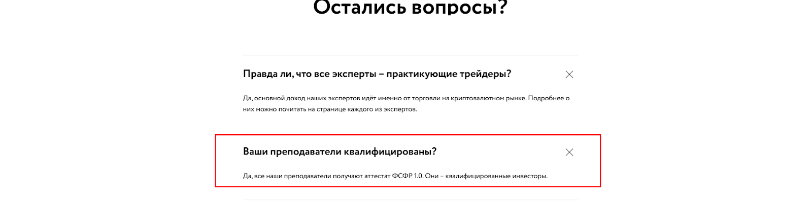 Онлайн школа MoneyFest уже давно ведет курс “Криптоинвестиции успешный старт”, где каждый год меняется лишь преподаватель. По словам разработчиков, каждый наставник это опытный трейдер, ведь он имеет аттестат ФСФР 1.0, однако документ лишь говорит о наличии базовых знаний о рисках / инвестировании, но не подтверждает навыки торговли, ведь экзамен на его получение включает исключительно теоретический материал.