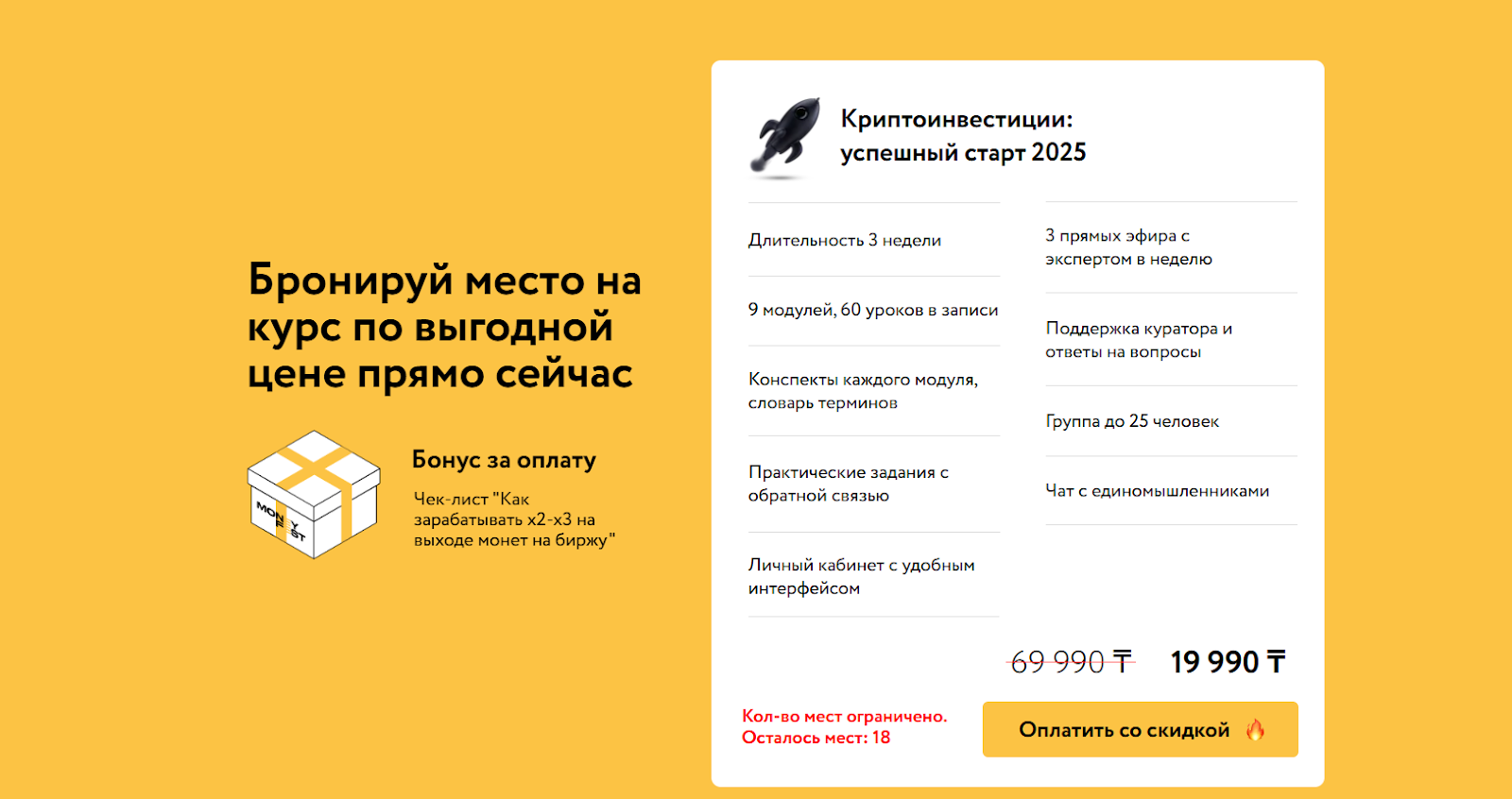 Всего курс длится 3 недели, а в стоимость оплаты, которая составляет 19990 тенге, входят 9 модулей и 60 уроков в записи с их конспектами. Также вы будете выполнять домашние и практические задания и проведете 3 прямых эфира и 2 бесплатных мастер-класса вместе с командой MoneyFest. И на первый взгляд подобные условия за 3 тысячи рублей кажутся выгодными, однако все зависит от качества информации, отзывы о которой негативные.
