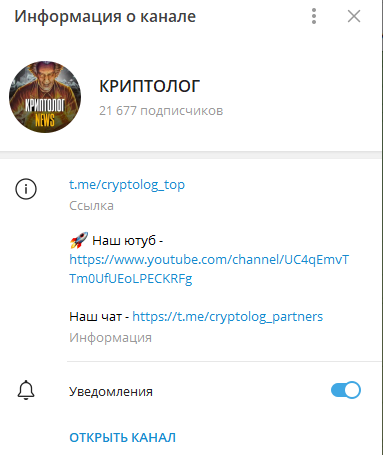 В ленте Криптолог в Телеграме публикуются криптовалютные новости. Трейдер постоянно публикует графики с парами токенов. Но ссылку на собственный инвестиционный портфель он не предоставляет.