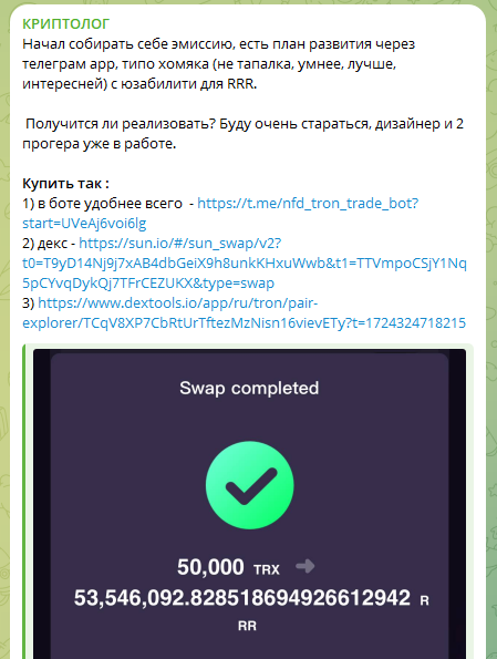 В последнее время трейдер занялся продвижением криптовалютных проектов и инвестиционных идей, в частности связанных с TRX и токеном $RRR. Он объявил сбор средств на рекламу проекта. Кроме того, трейдер делится информацией о планируемом запуске нового Телеграм-приложения, ориентированного на блокчейн TRX.