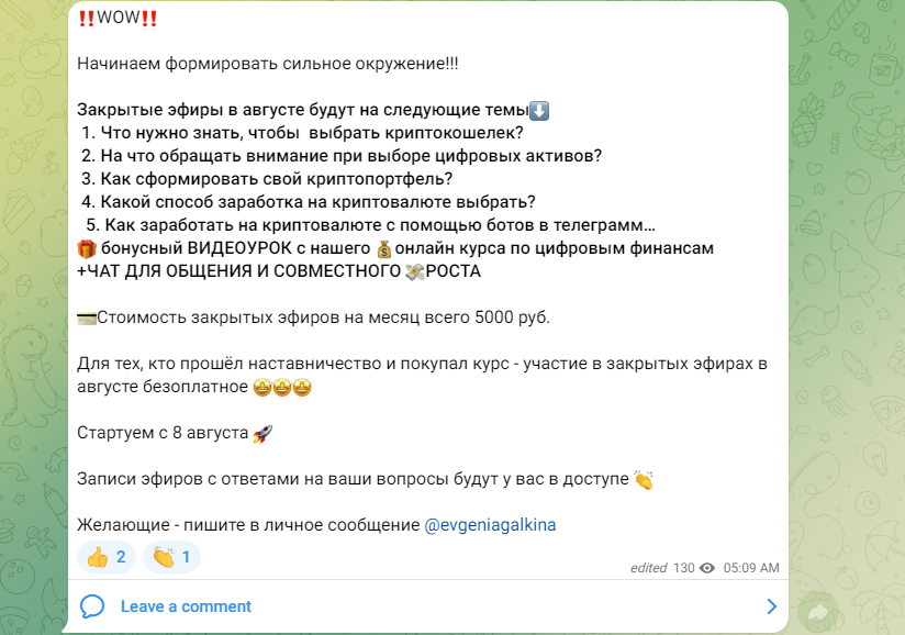 Мы крайне не рекомендуем телеграм канал Евгении Галкиной, “Криптовалюта глазами юриста” к сотрудничеству из-за высоких рисков потери денежных средств. Вот основные минусы: