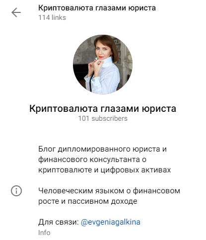Основной телеграм канал, Криптовалюта Глазами Юриста, был создан в 2022 году, как и остальные проекты, однако в настоящее время является заброшенным, а весь новый контент публикуется в общем тгк Lawyer Galkina.
