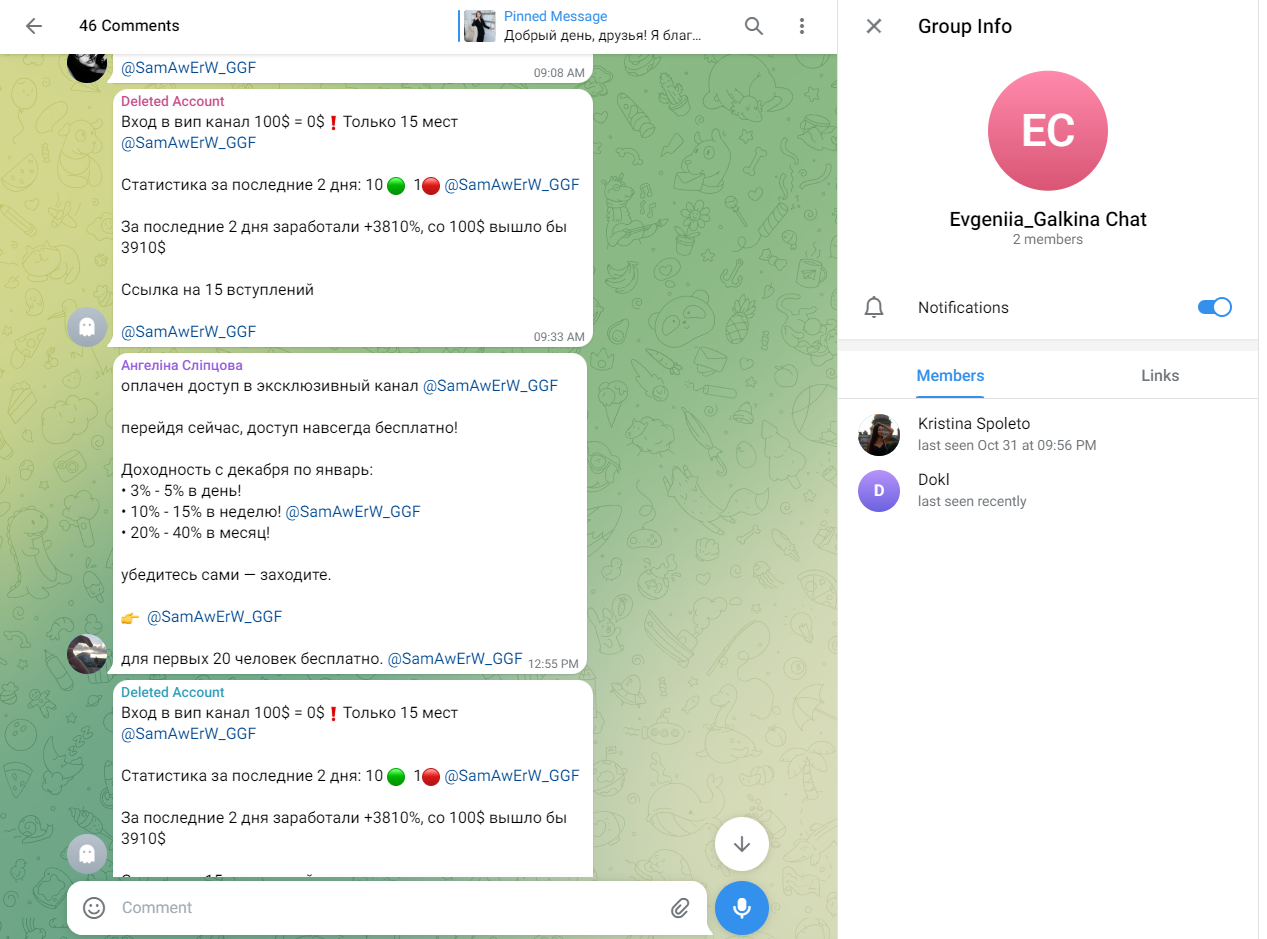 В самой ленте можно найти редкие публикации, где Евгения демонстрирует успешные сделки своих подопечных, однако все это отправляет в формате скриншота переписки, что не позволяет полагаться на такой тип данных.