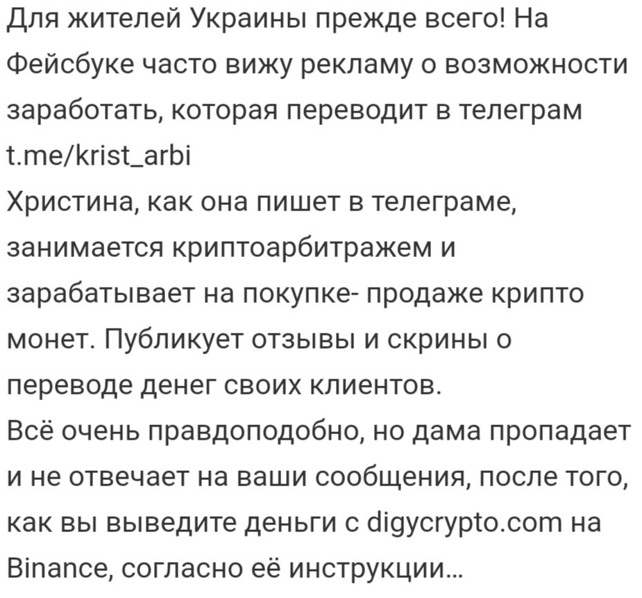 Суть заработка в следующем: Христина сама находит токены для арбитража, привлекает деньги подписчиков и делится частью прибыли. Типичная мошенническая схема раскрутки депозита. Ни один трейдер или арбитражник не будет привлекать деньги сторонних пользователей.На момент самой активной деятельности на канале Христины было 10 000 подписчиков. На момент написания статьи аккаунт заблокирован за мошенничество.