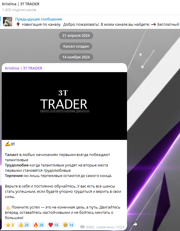 Телеграмм-канал «Kristina | 3T Trader» зарегистрировали в апреле 2024 года, но только в ноябре в ленте начали выкладывать первые посты. Многие посты в ленте были изменены, что создает дополнительные подозрения из-за возможной корректировки информации. В апреле 2026 года на ресурс подписано 1 405 человек, из-за чего Кристину сложно назвать успешным или известным трейдером.