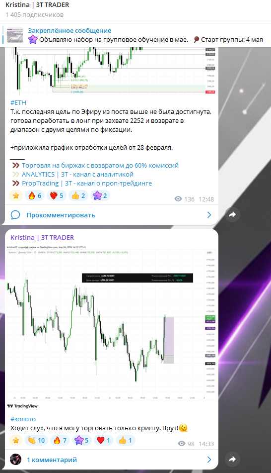 Обзор телеграмм-канала трейдера «Kristina | 3T Trader»: отзывы о торговле на бирже с Кристиной и оценка платных услуг проекта Trader_TTT