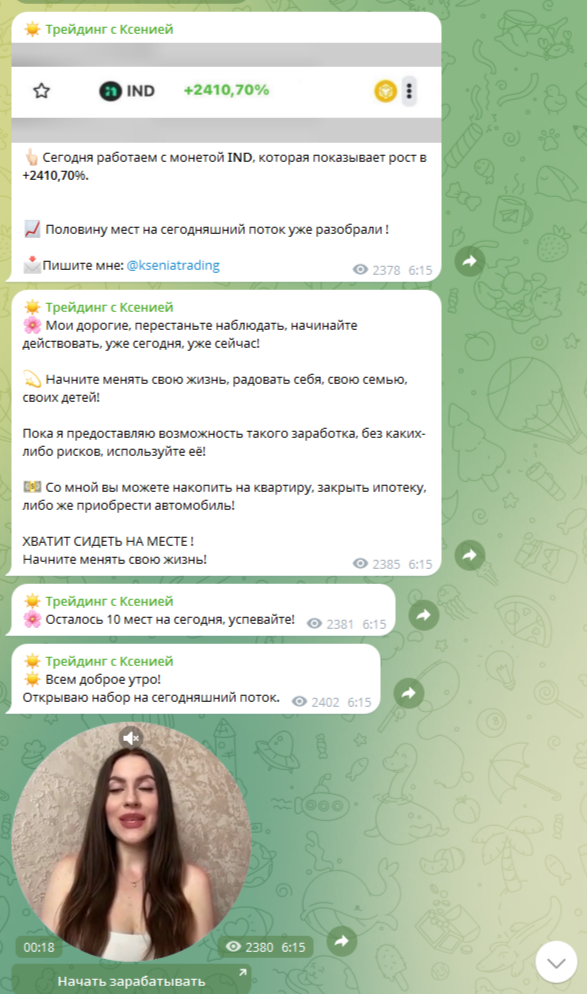 По сути, в телеграмме «Инвестиции Криптовалюты» выходит лишь один заготовленный набор постов, среди которых видеокружочки админа, объявление о наборе мест, отзывы клиентов и манипуляции.