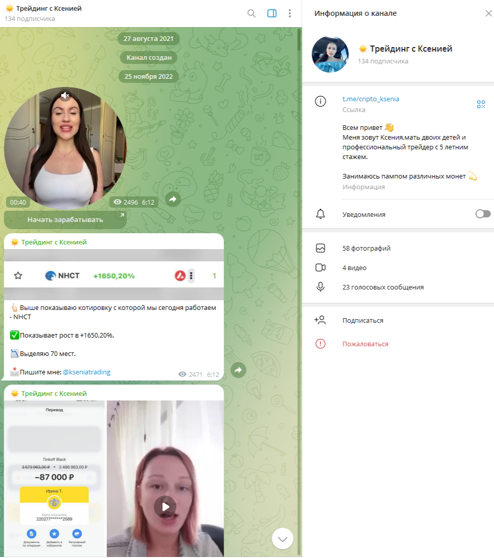 Канал «Инвестиции Криптовалюты в телеграмме» отзывы в интернете имеет только отрицательные. Автором проекта является профессиональный трейдер Ксения, которая помогает зарабатывать на пампе монет. Но последние два года этот канал перестал выпускать контент. В этой статье мы проверим деятельность девушки и попробуем выяснить, стоит ли с ней сотрудничать или это мошенница.