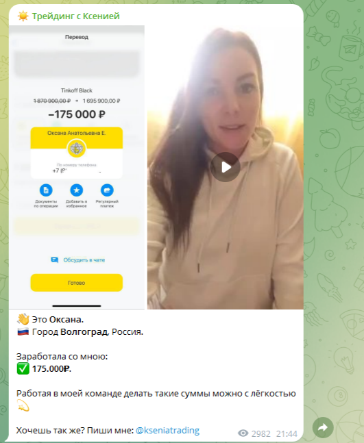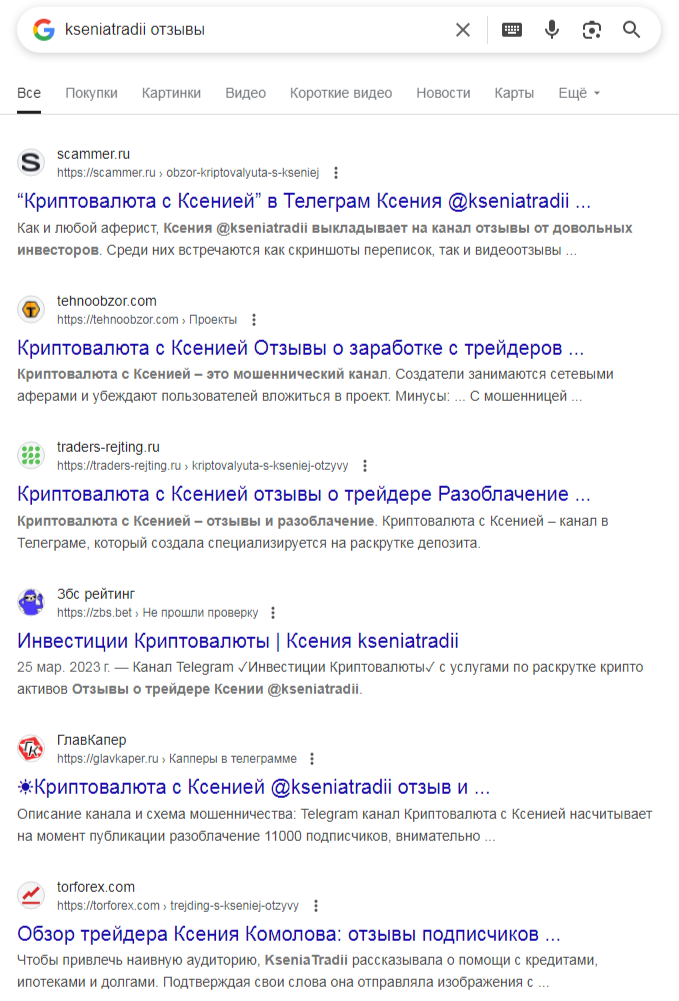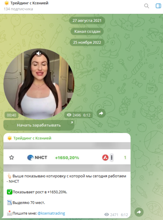 При проверке мы заметили, что отзывов от пострадавших клиентов в адрес @ kseniatradii почти нет. Возможно, на ее условия никто не попался и не стал покупать ее услуги. Однако наша проверка показала, что данный ресурс занимается обманом.