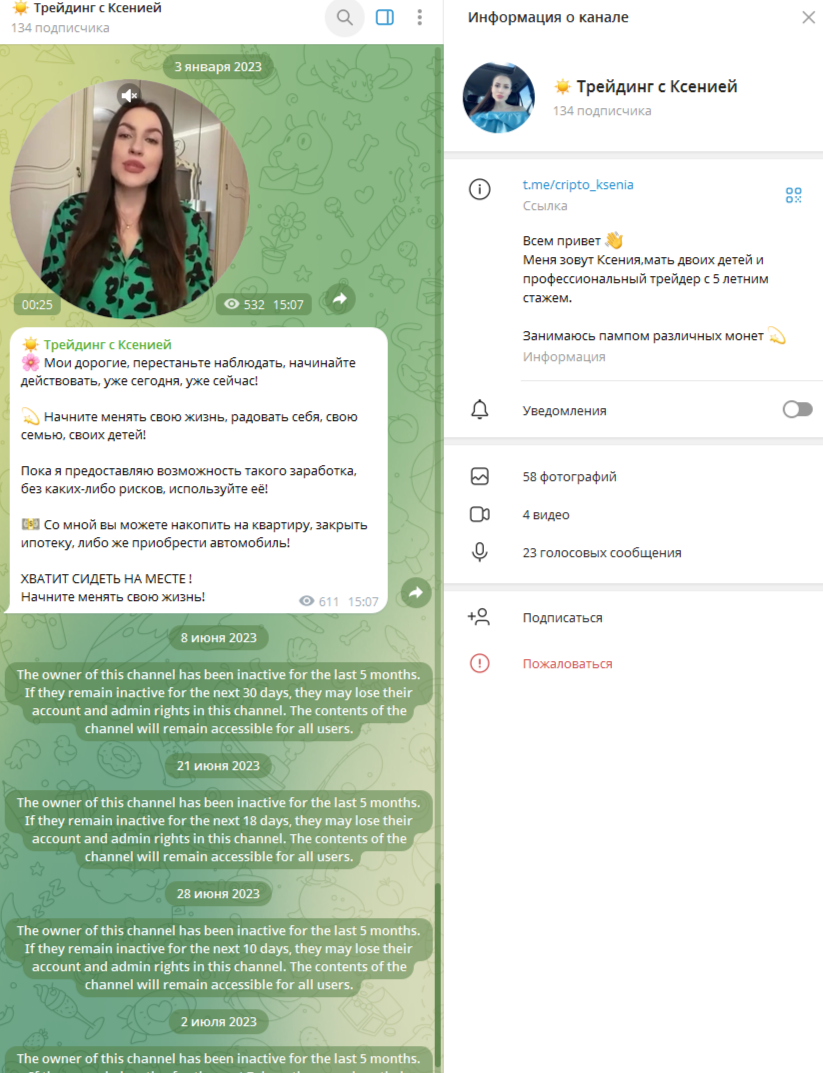 И похоже, это мошенническая система была прикрыта. Последний пост тут вышел 3 января 2023 года. В июне и июле 2023 года тут выходили автоматические сообщения от руководства мессенджера Телеграм.