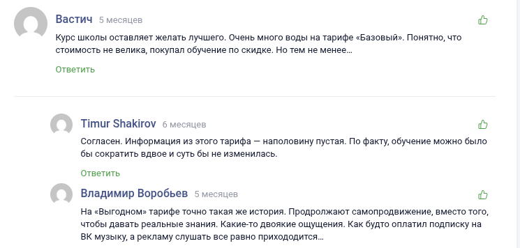 На независимых ресурсах ситуация совершенно иная. Пользователи часто характеризуют деятельность школы как чистый инфобизнес в плохом смысле этого слова. Основные претензии сводятся к следующему: