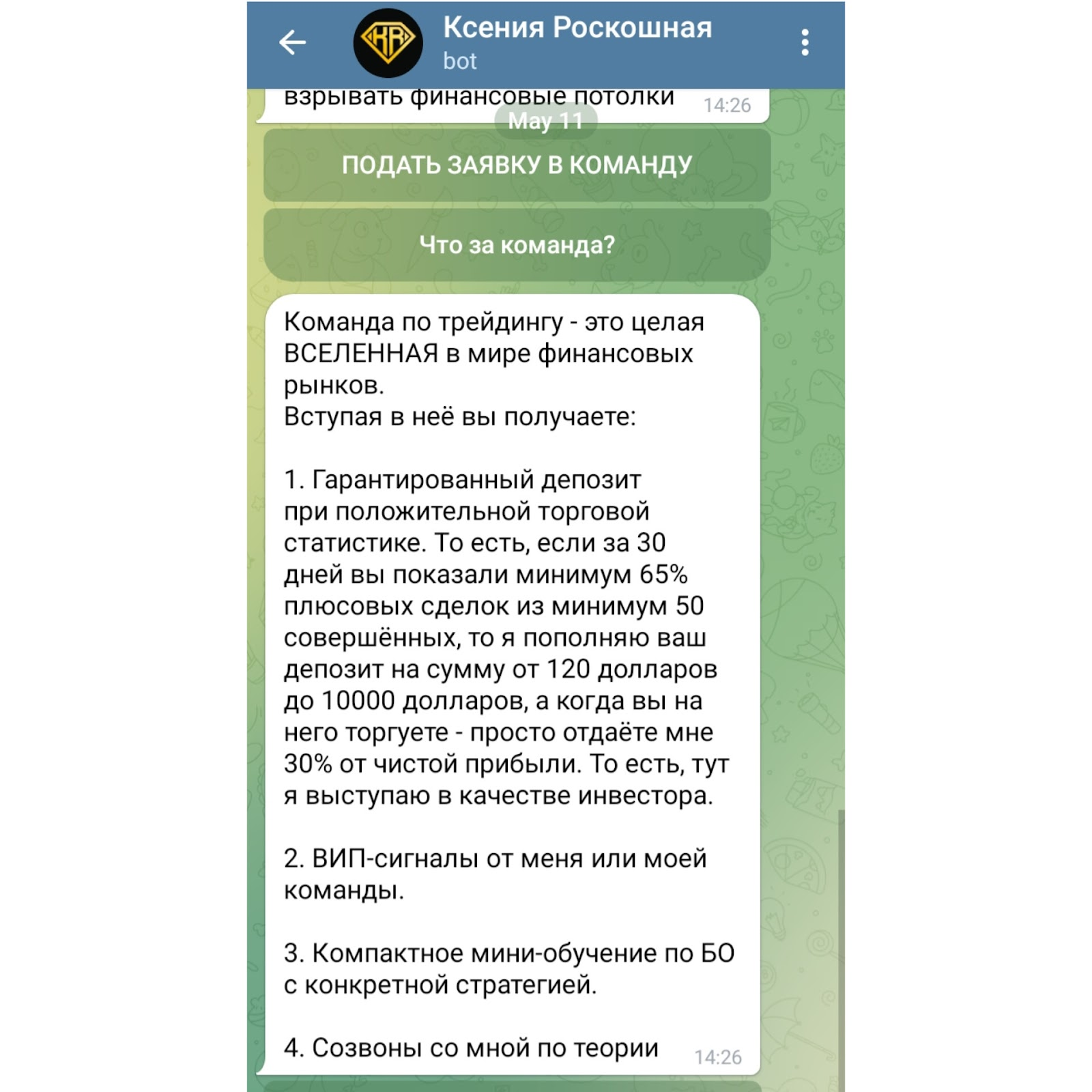 По всем вопросам можно обращаться в ТГ бот keyross support. Стоит отметить, что Ксения не ведет публичный портфель, не предоставляет верифицированной статистики сделок. В ее каналах низкая активность, а в комментариях далеко не самая лояльная публика. Пользователи пишут в сети, что roskoshnaya торгует на демонстрационном счете, а зарабатывает исключительно на рефералах. Брокер Покет Опшн платит до 80% за слив депозитов, а за прибыльные сделки клиентов только 5%. Разумеется, Ксении выгодно давать сигналы низкого качества, чтобы зарабатывать большую часть от вложений подписчиков.