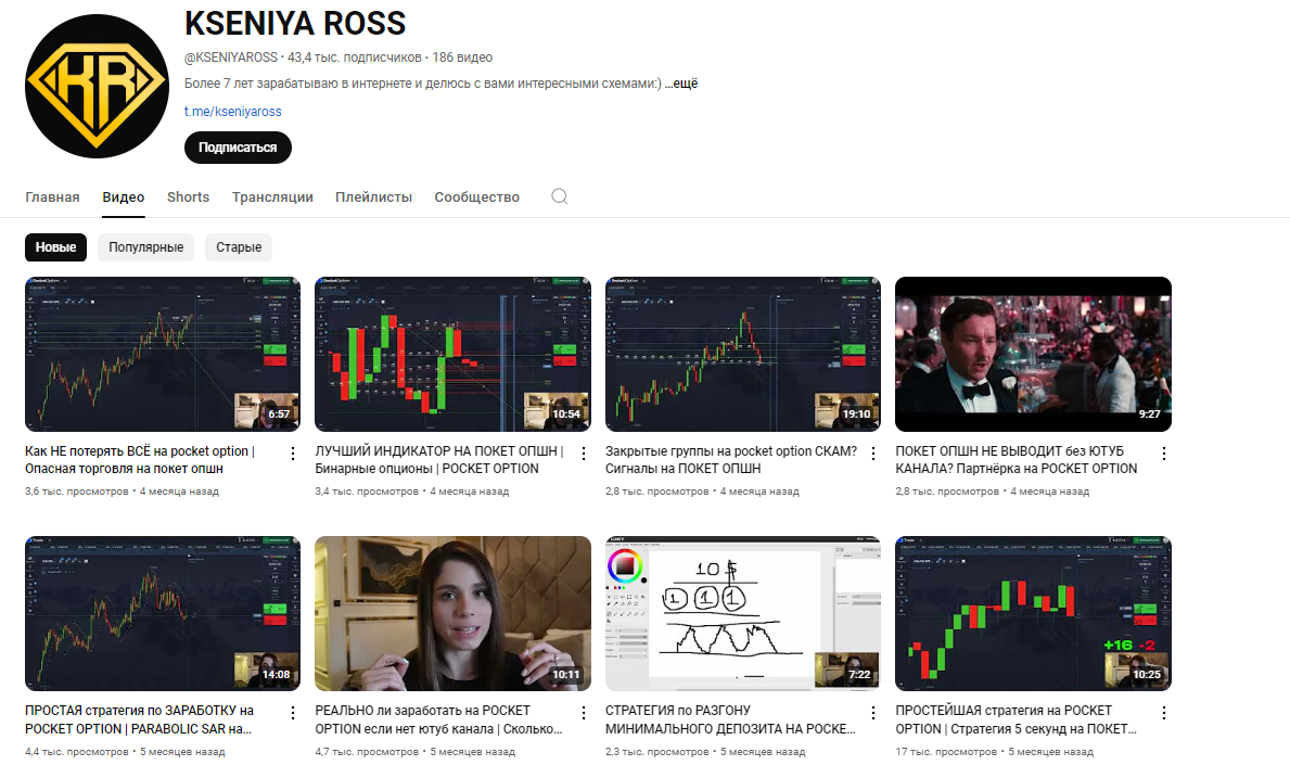 Kseniya Ross ведет Ютуб канал с аудиторией более 43 тысяч человек. В канале девушка выкладывает ролики на темы заработка в интернете, на бинарных опционах, на криптовалютной бирже и Форекс. Есть ролики о торговых стратегиях, а также псевдообучающие видео. Контент Ютуб Ксении Росс в среднем набирает 2-3 тысяч просмотров. Пользы в роликах девушки никакой нет. Также есть канал в ТГ Ксении Росс, в который ведется набор через Телеграмм бота, а также трафик сливается с нескольких промежуточных пабликов. Аудитория колеблется от 3 до 30 тысяч, вероятно, периодически чистят ботов или удаляют пострадавших от мошенницы клиентов.