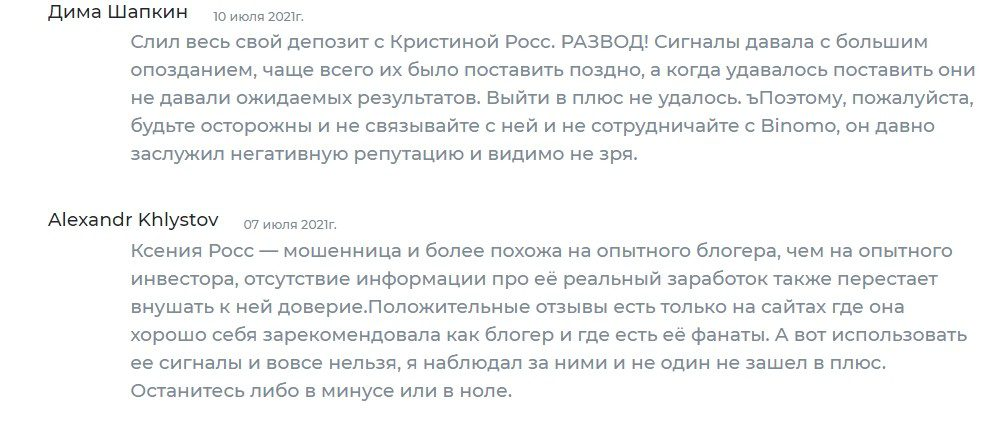 В сети довольно много отзывов о Kseniya Ross, они негативные. Дурная слава и у брокера бинарных опционов, на сайт которого девушка заманивает подписчиков. Ксению обвиняют в намеренном сливе клиентских депозитов. А брокера — в манипуляциях с котировками и невозможность вывода средств.