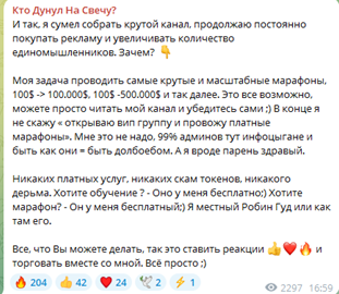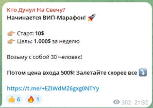 Во-вторых, в тг «Кто дунул на свечу» мужчина регулярно набирает инвесторов в марафоны. Причем стартовая сумма варьируется от 10 до 500 долларов. Участникам обещана совместная торговля, результатом которой станет раскрутка счета от 10 до 100 раз. Детали подобного марафона следует также уточнять у трейдера в личке, вероятнее всего потребуется регистрация по реферальной ссылке на BingX и подключение услуги автокопирования сделок за владельцем канала.