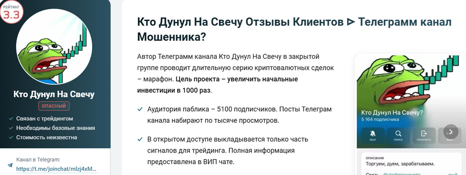На телеграм-канал «Кто дунул на свечу» отзывы отсутствуют. Его ведет анонимный трейдер, который рассказывает о тонкостях инвестиций в криптовалюту, и даже делится бесплатными уроками для новичков. Мужчина называет себя Робин Гудом инвестиций и бескорыстно помогает подписчикам. Но стоит ли ему верить – рассказали в новом обзоре.