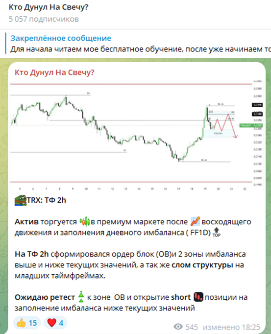 Контент на канале – это сигналы для совершения сделок, анализ малоизвестных монет и ожидания трейдера по изменению цены выбранного токена. При этом свои умозаключения мужчина подкрепляет графиками. Торгует на бирже BingX и активно продвигает данную площадку.