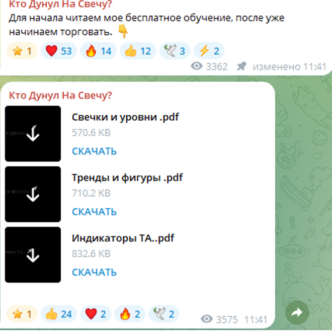 В одном из закрепленных сообщений на канале наш герой сообщает, что торговать необходимо только после прохождения обучения.