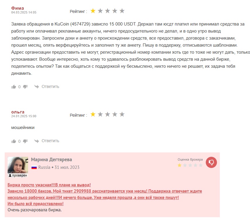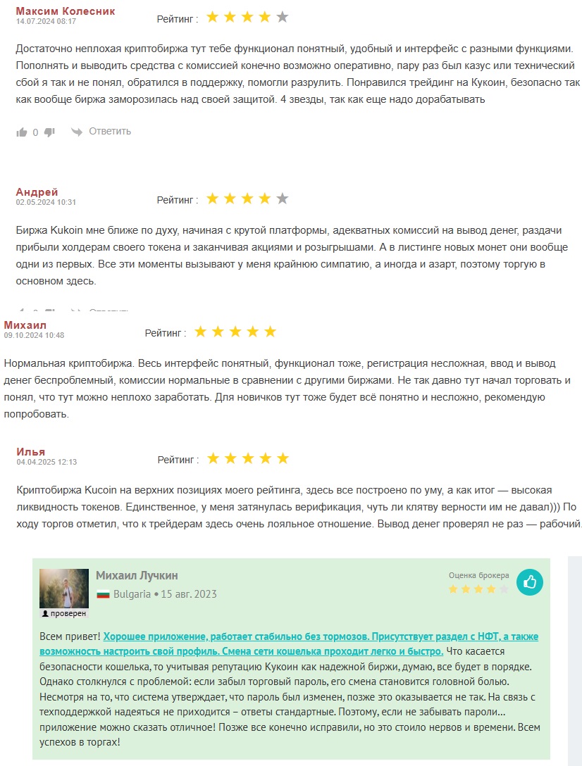 В сети есть очень большое количество отзывов о работе биржи КуКоин в целом и в частности о П2П направлении. В большинстве они позитивные, клиентов устраивает большой выбор валют, обеспечение безопасности, работа поддержки. Вот их примеры из русскоязычного сегмента.