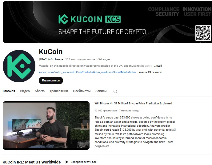 - YouTube — @kucoinexchange, 133К подписчиков;