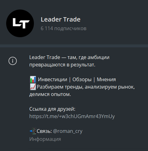 Лидер Трейд является информативным каналом, который ведёт Роман Дягтярёв. Темы затрагивают не только криптовалюту, но и экономику с политикой. Платных услуг не продвигается, кроме редкой рекламы. Посты могут быть полезны, но применять полученные данные нужно с осторожностью.
