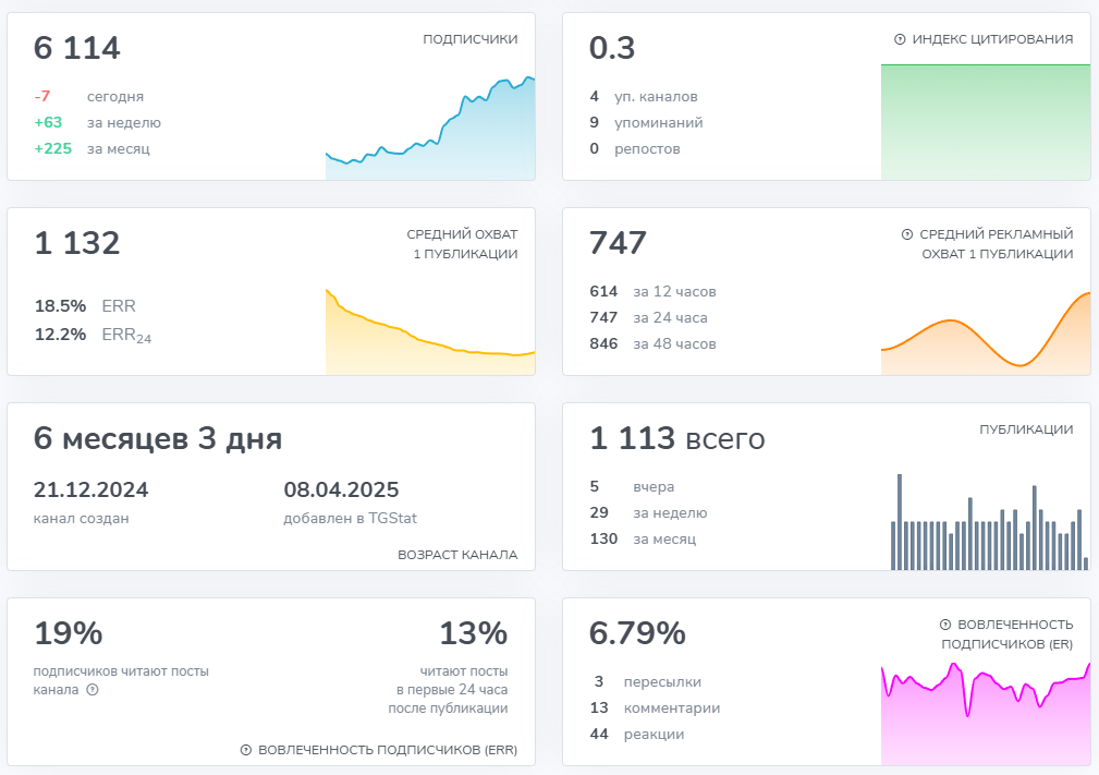 На момент написания статьи, число подписок составило – 6.117 человек. Среднее количество просмотров равняется – 1.132 глаз на пост. В день могут публиковаться 3-5 записей.