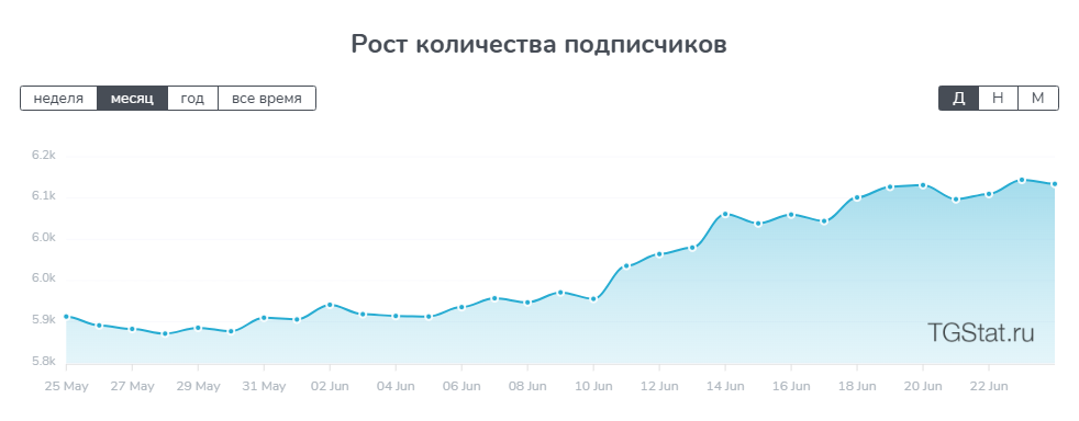 Ежедневная вовлеченность – 6.79%. Индекс цитируемости находится довольно низко – 0.3 пункта. Наблюдается плавный рост числа подписчиков, начавшийся 10 июня. С того времени на канал подписалось – 228 пользователей.