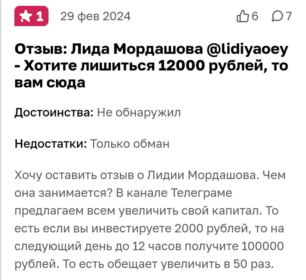 Также, в интернете есть очень много отзывов о Лидии Мордашовой, о ее деятельности. Пользователи делятся негативным опытом сотрудничества, жалуются, что отправили деньги, но в итоге ничего не обнаружили на своих счетах. Пишут, что это только обман, это настоящая мошенница. К своим комментариям прикрепляют также скриншоты переписки с данным человеком.