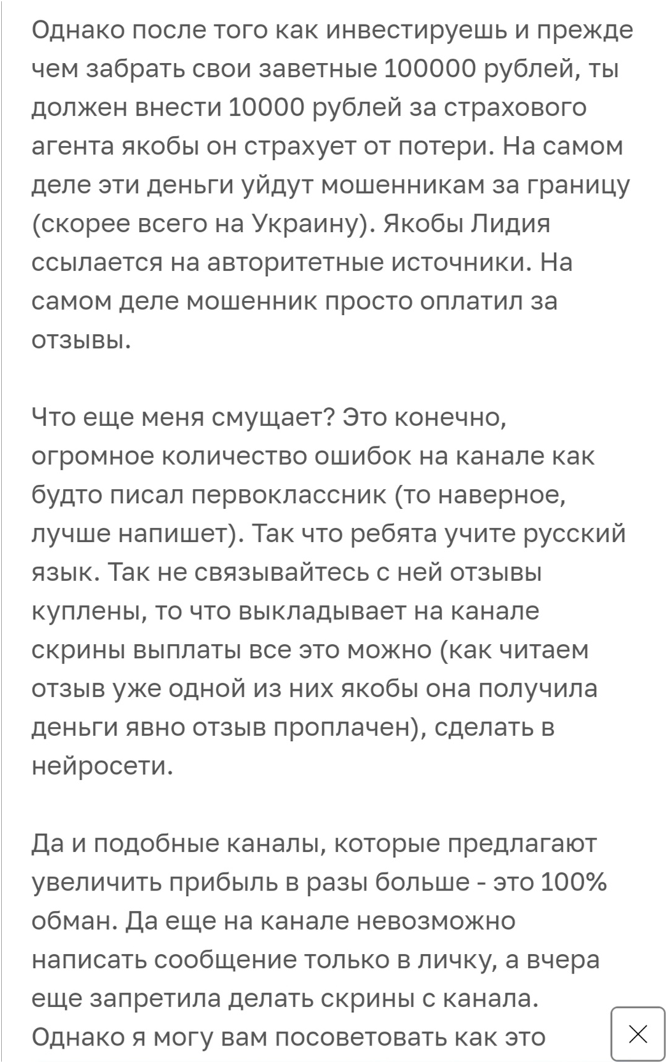 «успешный инвестор» только по версии самой Лидии . В реальности — очередной эксперт по платным «услугам», которые якобы откроют тебе двери в мир финансовой свободы. Сам канал — это набор заезженных фраз и обещаний..