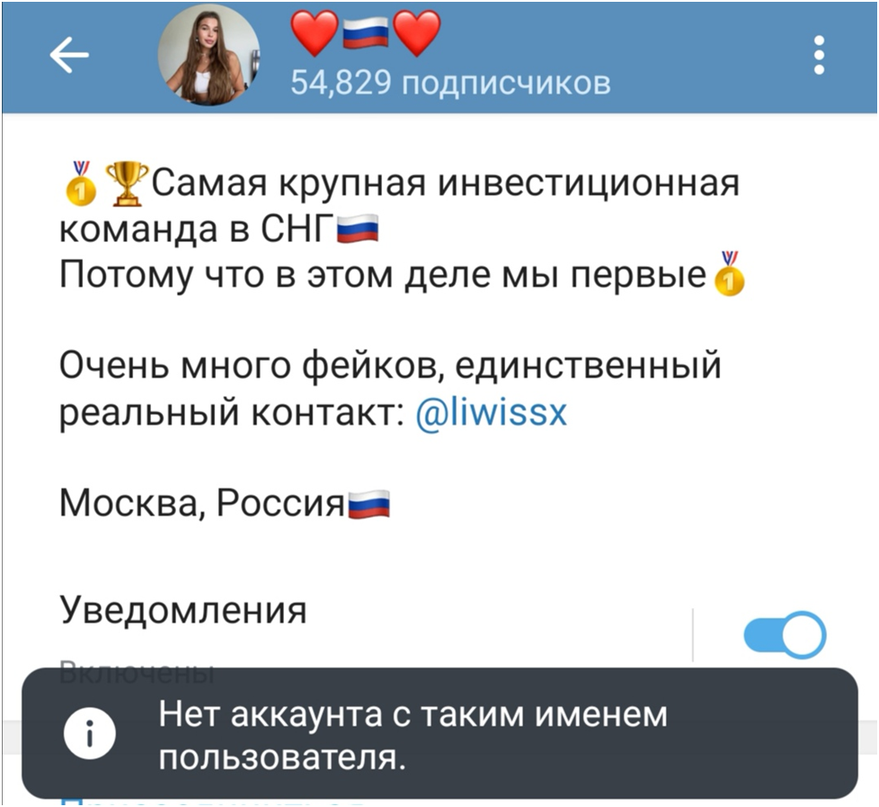 Телеграм-канал предлагает поучаствовать в работе совместно. Минимальное вложение – 2000 рублей. Она обещает, что средства будут увеличены в 50 раз. Неплохой плюс. В описании к каналу указано, что пора зарабатывать, хватит уже работать за копейки. Объясняется, что это самая крупная инвестиционная компания в странах СНГ, что они самые первые в деле. Единственный реальный контакт не существует.