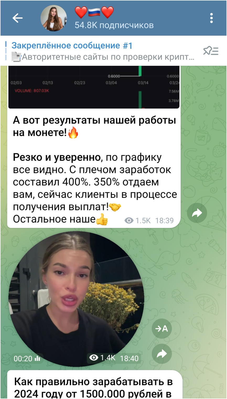 В Телеграмм девушка на видео рассказывает об инвестициях, о своих заработках, показывает вечерние отчеты об удачных инвестициях и сделках. Приводит списки сайтов для проверки крипто-компаний. Главный инструмент для заработка, который рассматривает Лидия Мордашова – крипта.Рассказывает, что вложив 2000 рублей по базовому тарифу, человек получит 100 000, с 3000 — 200 000, а с 5 и вовсе 300 тысяч рублей. Складывается впечатление, что услуги она оказывает бесплатно, так как информации о каких-либо комиссиях с ее стороны, нет.