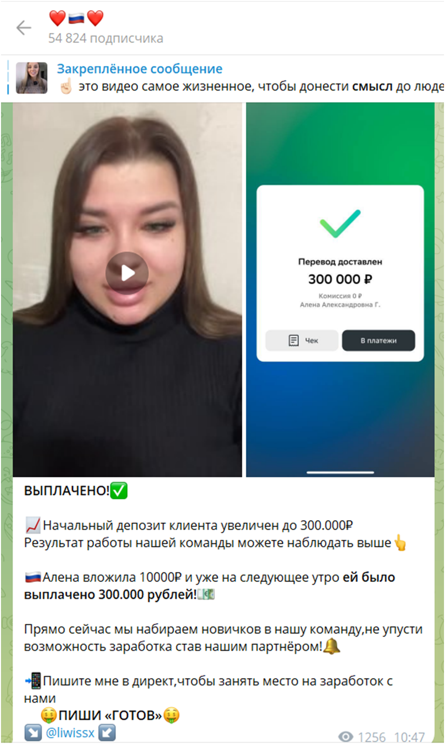 Я вкинул 2к ради интереса ну чё, 100к обещала же! Через неделю пишет. Чтобы вывести, нужно добавить ещё 3к. Ну ок, добавил… и всё! Исчезла. 🤬 Видео клиентов в телеге это актёры или боты, уверен! Никто не получил бабок. А я теперь даже имя Лидия слышать не могу, тошнит!