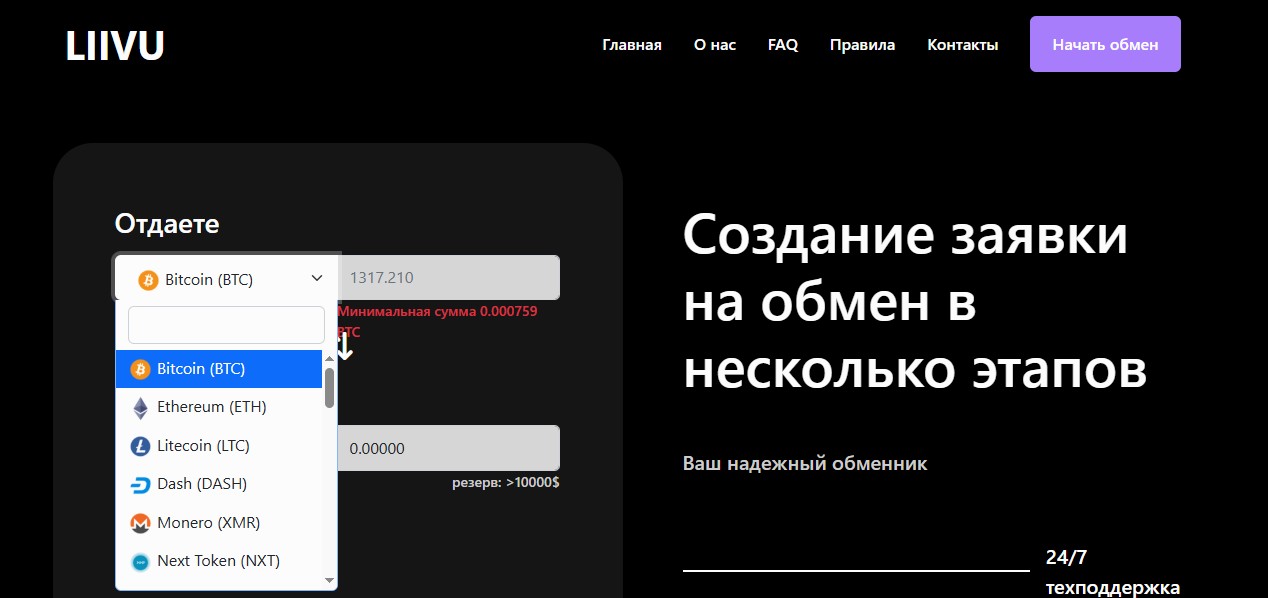 Обменник liivu com предлагает неплохой выбор криптовалют и удобные варианты вывода фиата. На первый взгляд, здесь отличный сервис для трейдеров и арбитражников – универсальная площадка с быстрой конвертацией самых популярных монет.