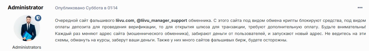 Как именно вас обманут? Схема нацелена на новичков и неопытных начинающих трейдеров, основан скам сугубо на социальной инженерии. Мошенник находит будущую жертву в тематическом ТГ-чате, втирается в доверие под видом «помощника» и предлагает «профитную» арбитражную связку. Легенда гласит, что можно дешево купить крипту в одном месте, а затем очень выгодно продать ее через Liivu. Как только вы заводите монеты на кошелек псевдо-обменника, игра заканчивается. Все деньги наивных «клиентов» уходят в один конец, а «доброжелатель» из чата и техподдержка исчезают.