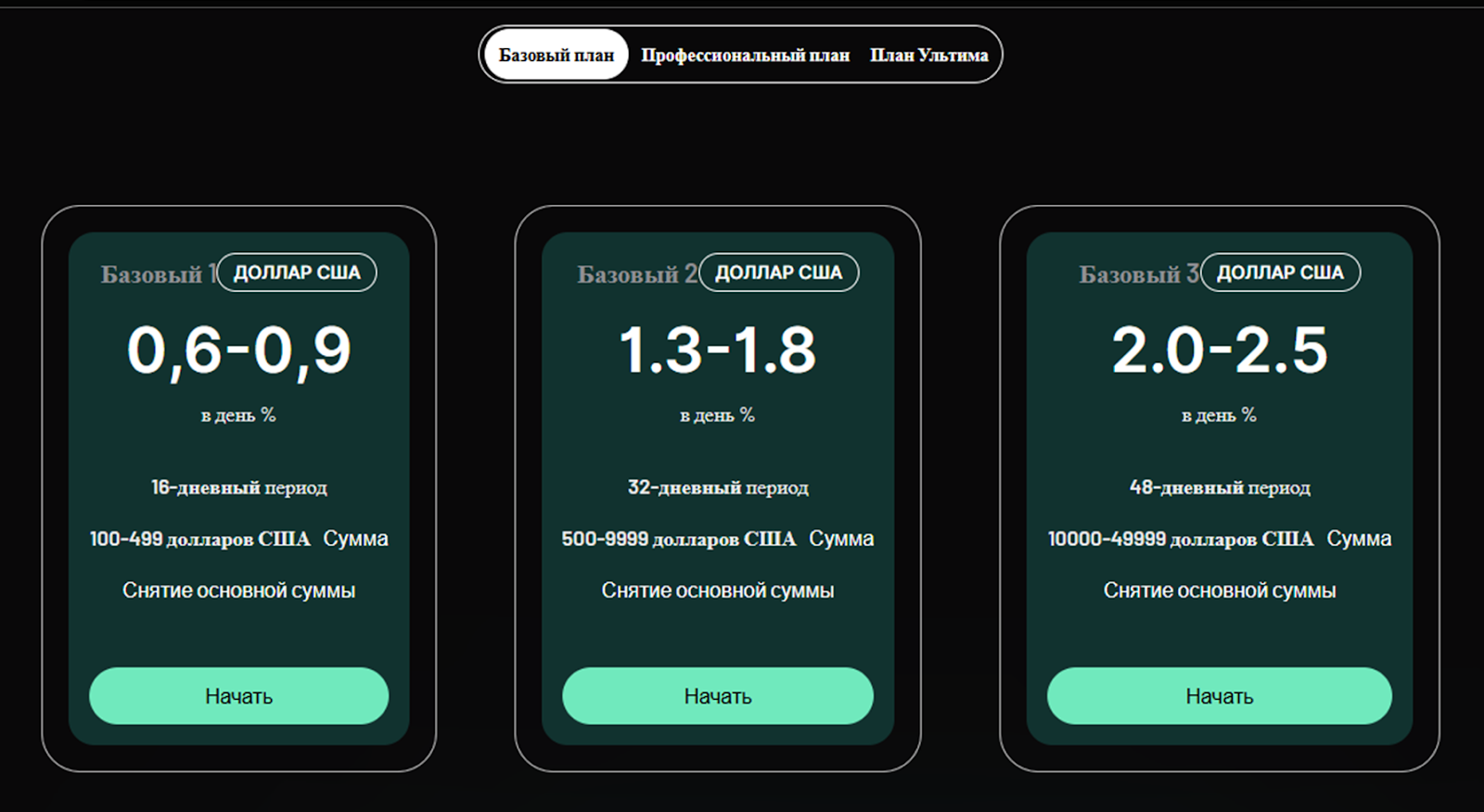 Для инвесторов разработано три вида тарифов – «Базовый», «Профессиональный» и «Ультима». Каждый из них имеет от 4 до 6 подвидов. На базовом тарифе можно заработать от 0,6 до 3% в день, при стартовых вложениях в 100 долларов, наибольшая сумма на данном тарифе – 50 000 долларов. Срок инвестиций 64 дня. Вложения осуществляются в долларах США.