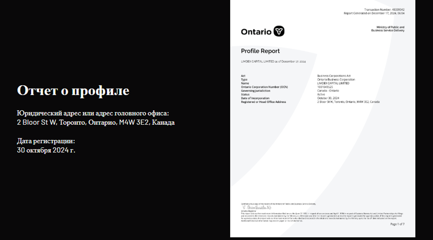 И хотя заявлен срок существования компании с 2020 года. Официально она была зарегистрирована в начале 2025 года в Канаде. Адрес офиса в Онтарио указан, предоставлены и копии документов.