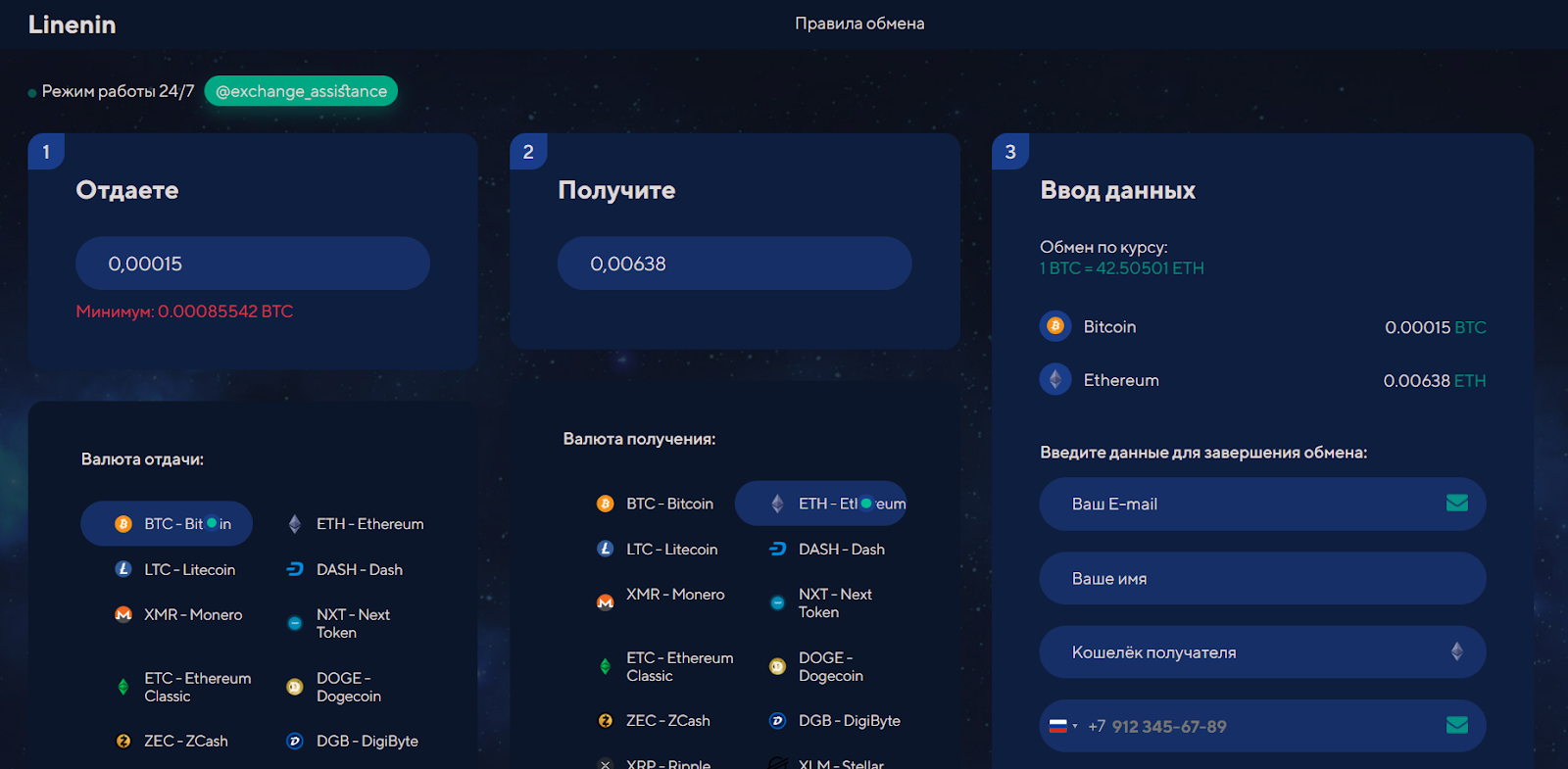 Платформа linenin com представляет собой одностраничный сайт. При загрузке площадки сразу же открывается форма обмена. Здесь есть три основных раздела: валюта, которую отдаете, которую желаете получить и форма для ввода контактных данных. Для отдачи и получения представлено по 25 видов монет. Для совершения операции потребуется указать кошелек, имя, номер телефона и электронную почту. Эти сведения необходимы на случай, если менеджерам потребуется связываться с клиентом по вопросам обмена.