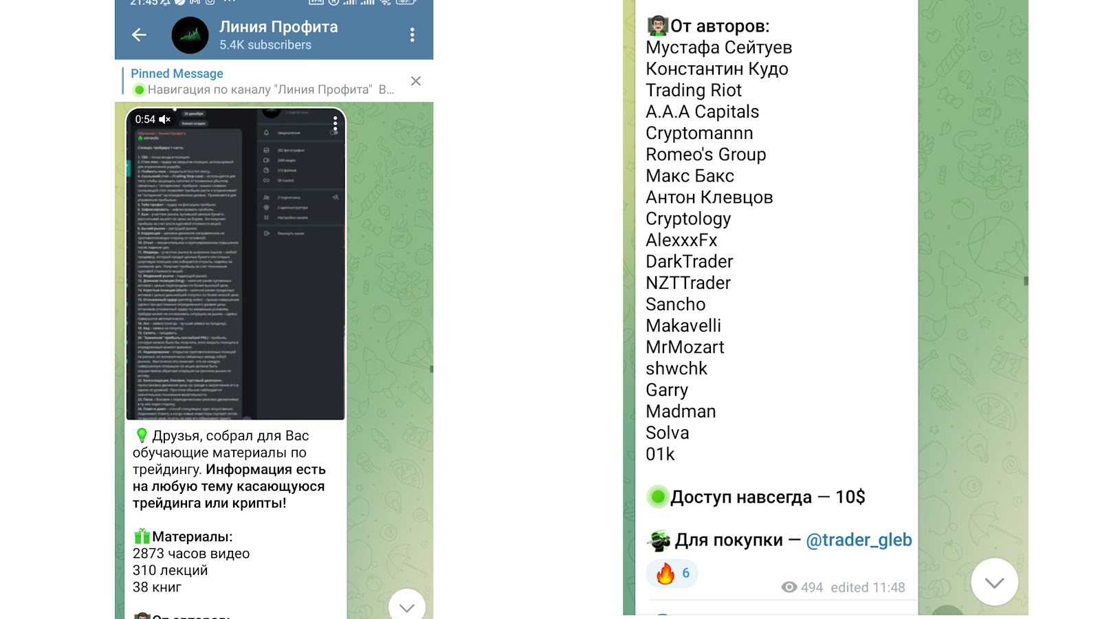 Трейдер Глеб предлагает присоединиться к группе, где собраны обучающие материалы по трейдингу. Всего будет доступно: 2 873 часов видео, 310 лекций и 38 книг. Авторами материалов являются трейдеры: Мустафа Сейтуев, Макс Бакс, Константин Кудо и прочие эксперты. Вечный доступ обойдется в 10 долларов.
