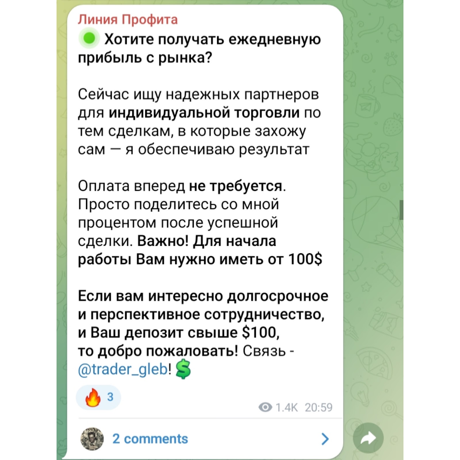 Также автор ищет партнеров на индивидуальную торговлю. Пользователям будет предоставлять торговые сделки, а клиентам нужно их копировать. По словам создателя, они принесут высокий профит. Главное условие сотрудничества — иметь от 100 долларов депозита.