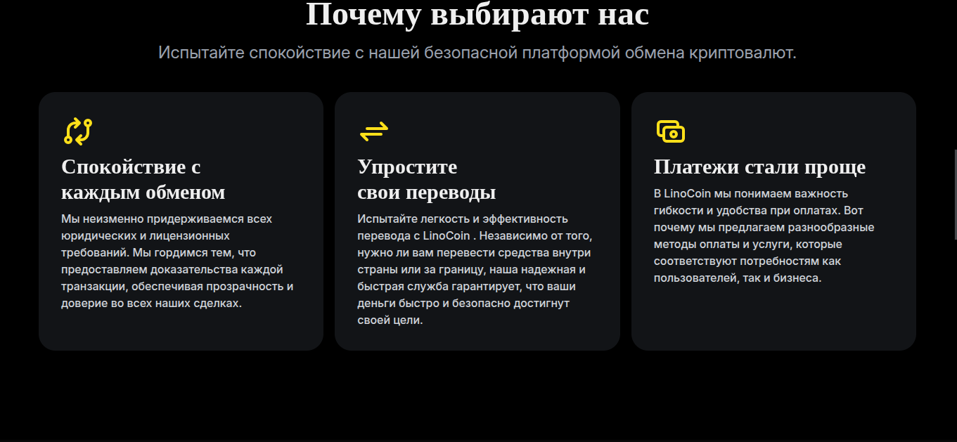 В отзыве об обменнике https Linocoin com хотим сказать, чтобы как-то заполнить пустоту интерфейса, команда проекта прикрепила список преимуществ. Для привлечения внимания целевой аудитории команда платформы сообщила про спокойствие и высший уровень безопасности каждого пользователя.