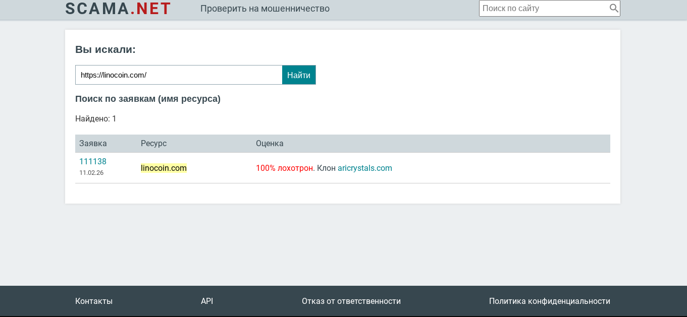 Ни одно из преимуществ не подтверждено реальными фактами. Кроме того, у обменника Linocoin com отсутствует настоящая ликвидность. Следовательно, все что пишет команда про гарантию конвертации активов — блеф. Веток на форумах у проекта нет, как и социальных сетях. Кроме того, через инструмент Scama net мы нашли копию платформы. Клон — Aricrystals com.