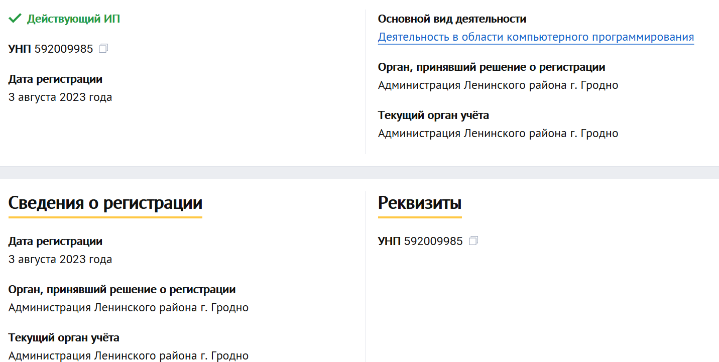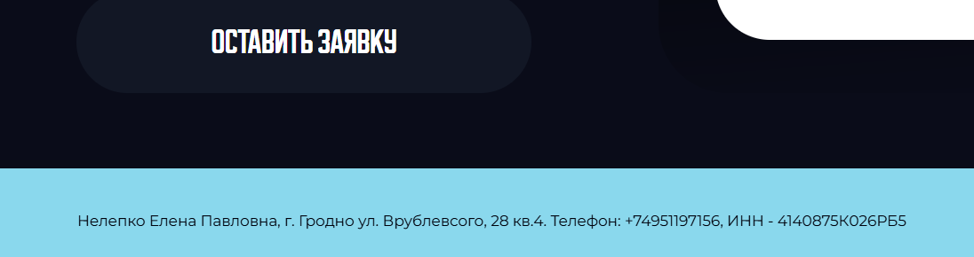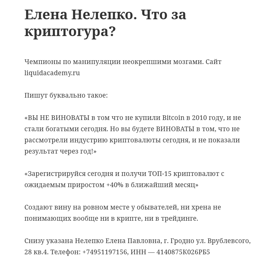 Доменное имя сайта на момент обзора существует 1 год 7 месяцев. При этом нет практически никаких упоминаний в сети от учеников. Такая тишина выглядит максимально странно, учитывая бесплатный вариант обучения и многообещающее наставничество.Деятельность ведется от предпринимателя из Белоруссии Нелепко Елены Павловны. Однако согласно официальным данным Елена Павловна не оказывает никаких финансовых услуг, а занимается компьютерным программированием.
