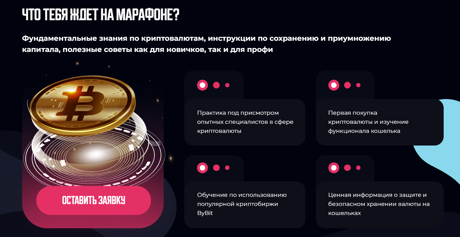 Студентов ждет практика под присмотром опытных специалистов. Биржа, на которой будут проводить сделки участники марафона – Bybit. В рамках курса предполагается первая покупка криптовалюты. Из данного оффера можно сделать вывод, что участников собирают в качестве рефералов, а бесплатный марафон и и обучение (по факту – базовая информация из открытых источников) являются наживкой для регистрации пользователей. Заметим, что Bybit вытягивает деньги из новых клиентов как раз через различных мутных партнеров, задача которых – затягивать рефералов, представляясь опытными экспертами.
