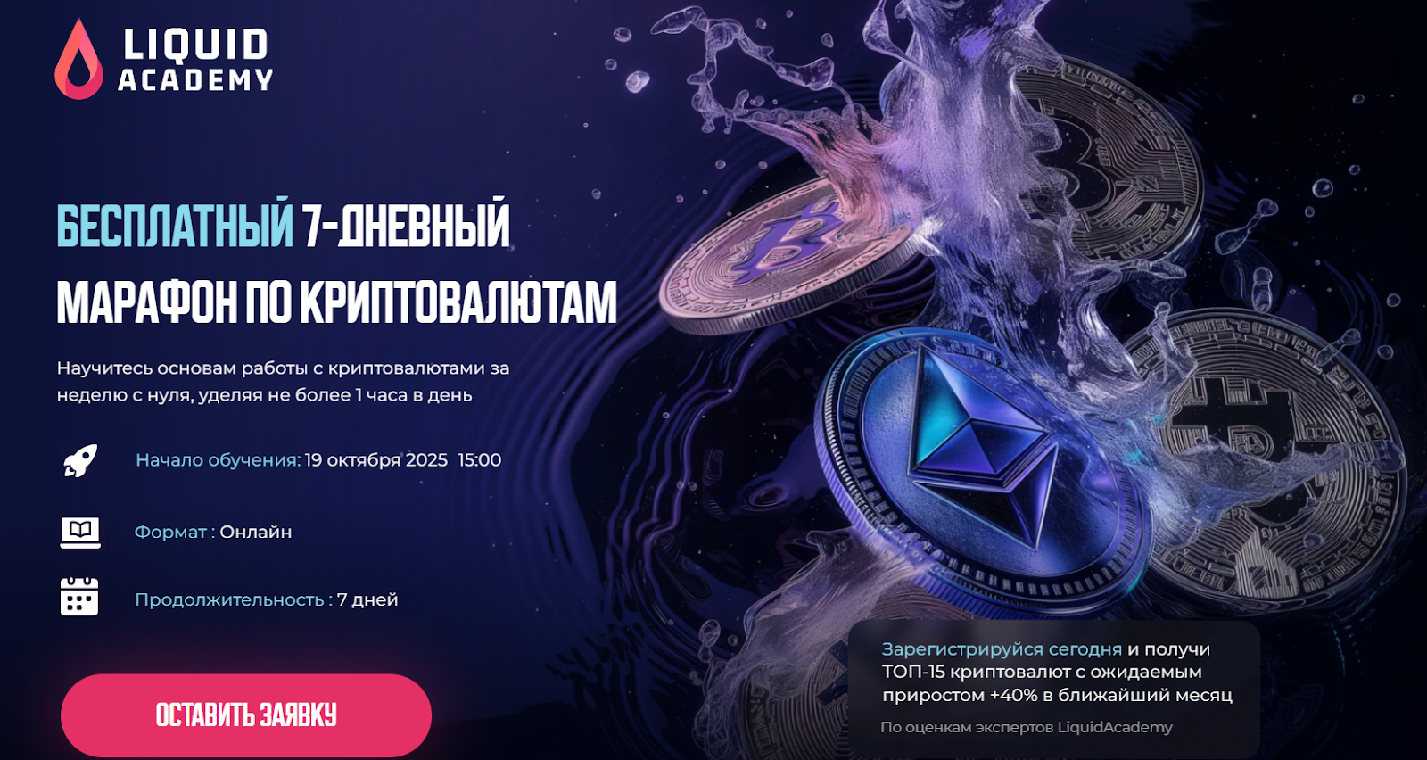 Продолжительность обещанного бесплатного обучения – неделя, оно стартует 19 октября 2025 года. На сайте представлена форма для заявок участников. Анонимный автор предлагает присоединиться даже новичкам, которые якобы узнают основы работы с криптой. При этом образовательный курс будет длиться всего по часу в день.