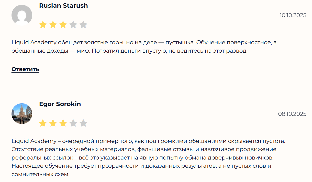 Все найденные отзывы о проекте Liquid academy негативные. В одном комментарии пользователь, который сомневается в честности проекта, обоснованно задается вопросом как монетизируется подобная деятельность. Попытка неизвестного лица набрать на обучение новичков в трейдинге таргетирована на создание своей реферальной сетки.