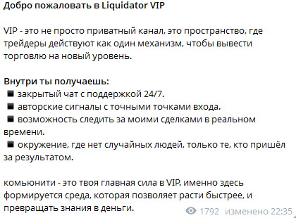 Также трейдер ведет закрытый канал «Ликвидатор VIP». Вступив в него, подписчик якобы получит авторские сигналы с точными точками входа, а также общение с особым «комьюнити».Подписка на закрытое сообщество платная: от $33 в месяц. Трейдер предлагает оплатить ее со скидкой около 50%. Это может означать низкий спрос на его услуги.